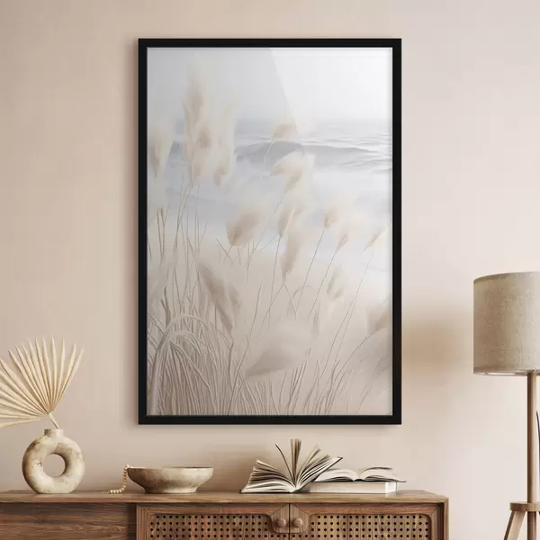 Poster Magas, tollas pampas fű lágy bézs árnyalatokban az előtérben, homokos stranddal a háttérben Nr f47432