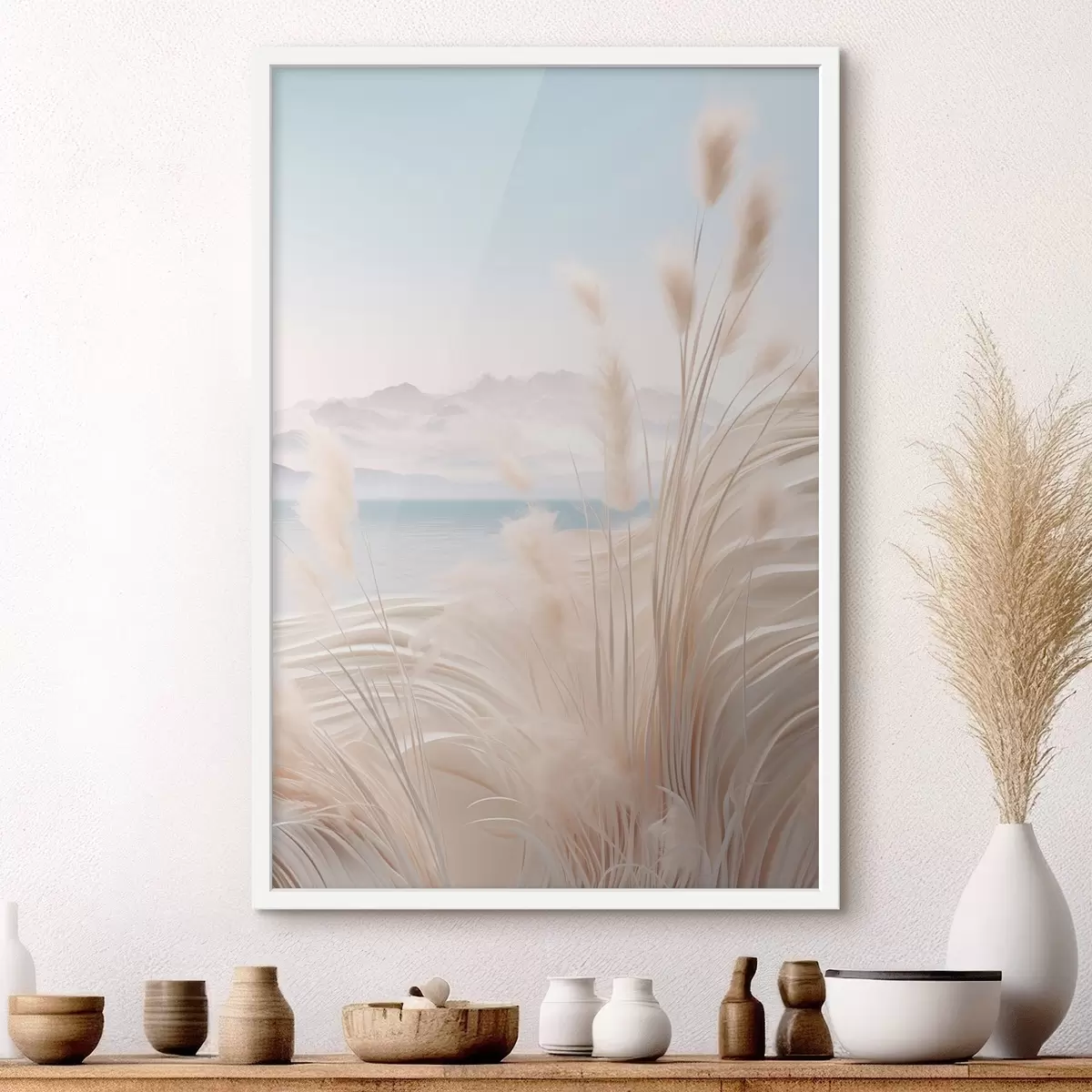 Plakát a sziklán Magas, tollas pampas fű puha bézs árnyalatokban, homokos stranddal és hegyekkel a háttérben f47433