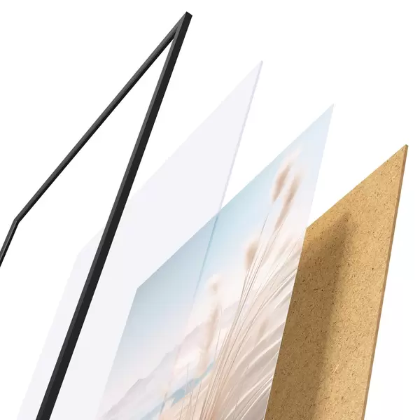 A poszter keretből, plexiből, nyomtatott képből és forgácslap hátlapból áll. A poszter a hátoldalon található rögzítőknek köszönhetően azonnal felakasztható a falra.