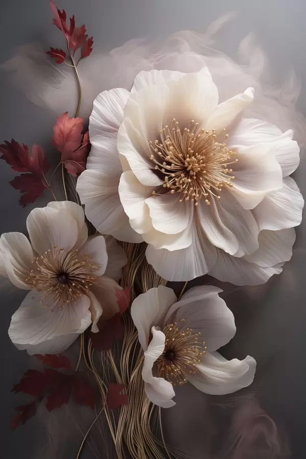 Poster Finom pünkösdi rózsák vékony, szálas szirmokkal, sötétvörös levelekkel körülvéve, absztrakt háttér előtt Nr f47434
