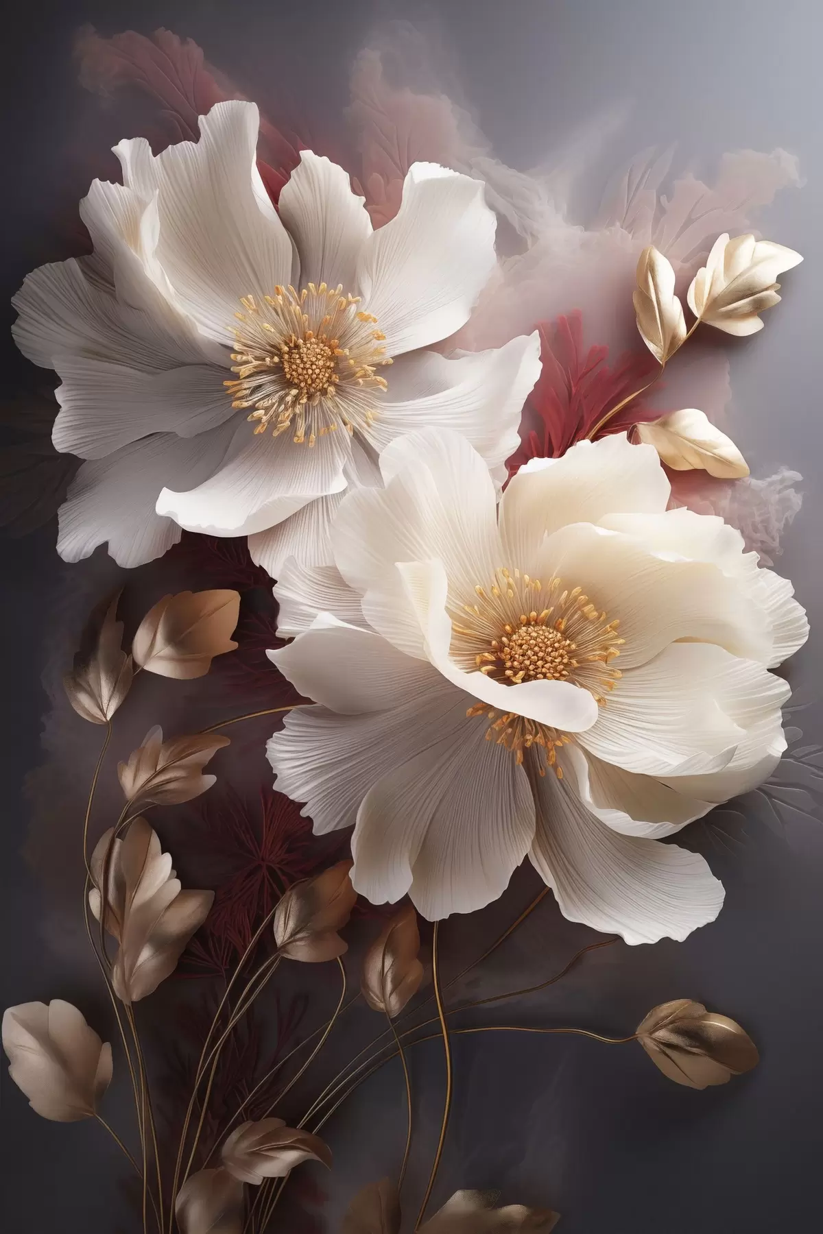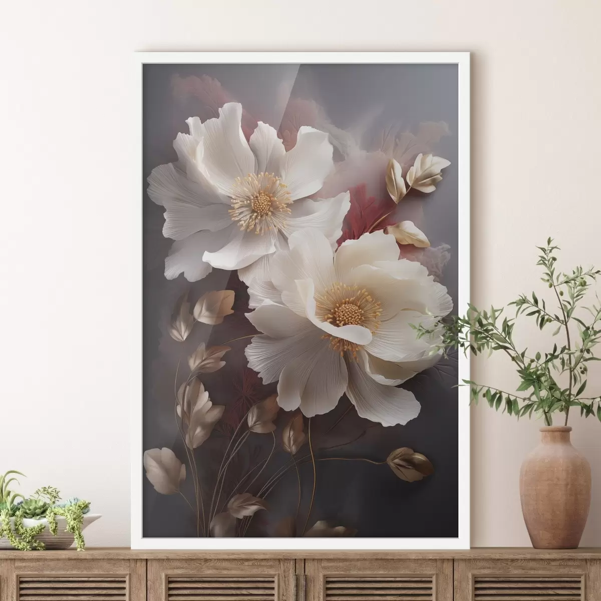 Poster Finom pünkösdi rózsák vékony, szálas szirmokkal, sötétvörös és sárga levelekkel körülvéve, absztrakt háttér előtt Nr f47435