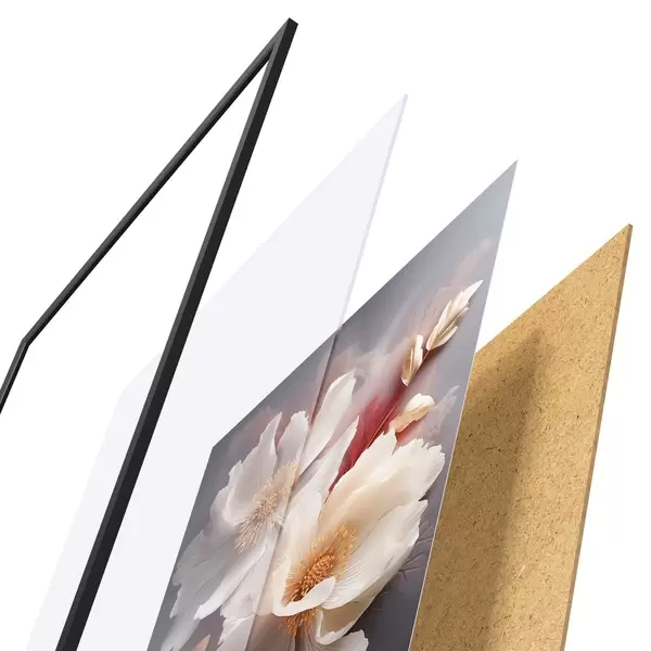 A poszter keretből, plexiből, nyomtatott képből és forgácslap hátlapból áll. A poszter a hátoldalon található rögzítőknek köszönhetően azonnal felakasztható a falra.
