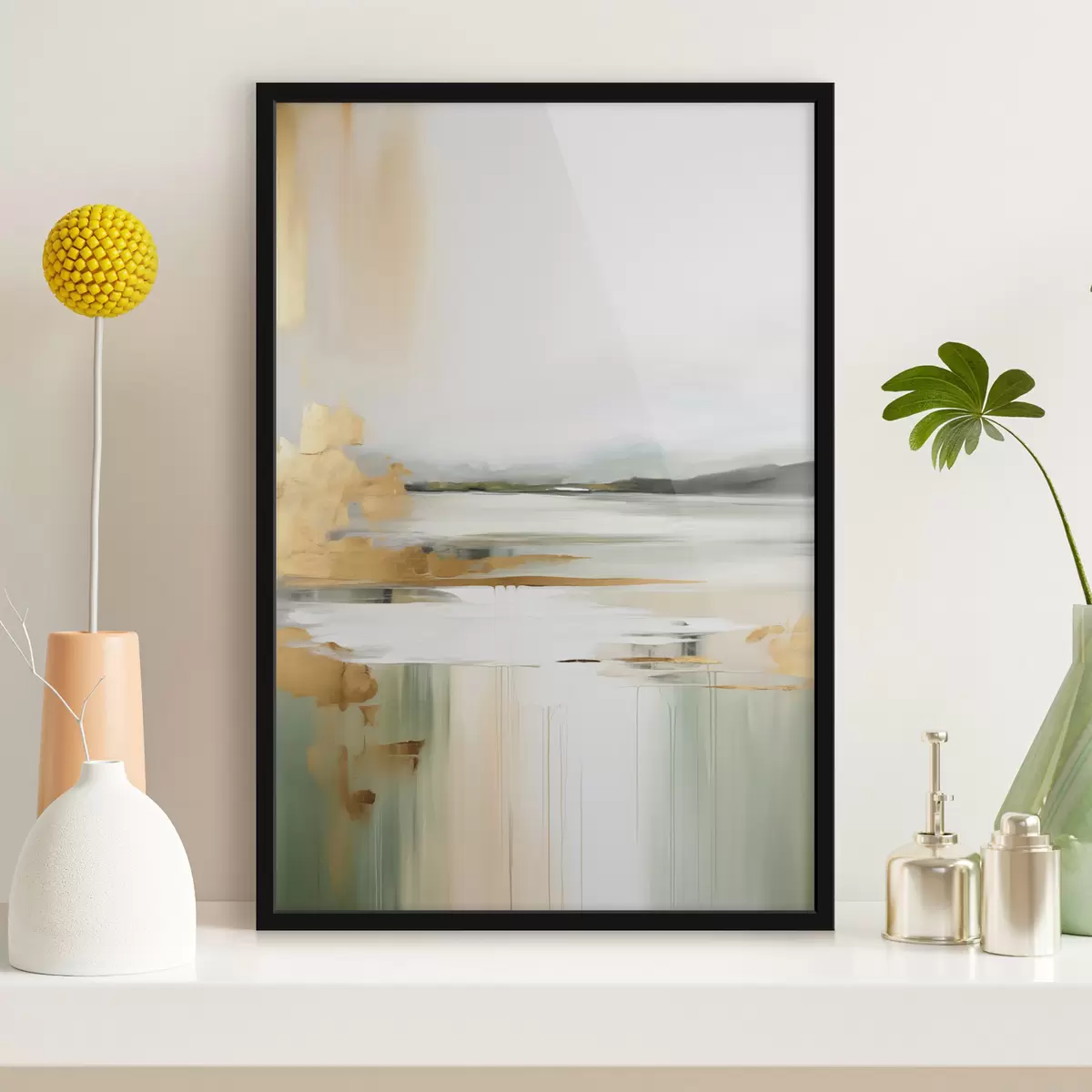Poster Absztrakt táj sárga és zöld árnyalatokkal, az eget és a távoli hegyeket tükröző víz, halvány, ködös égbolt Nr f47438