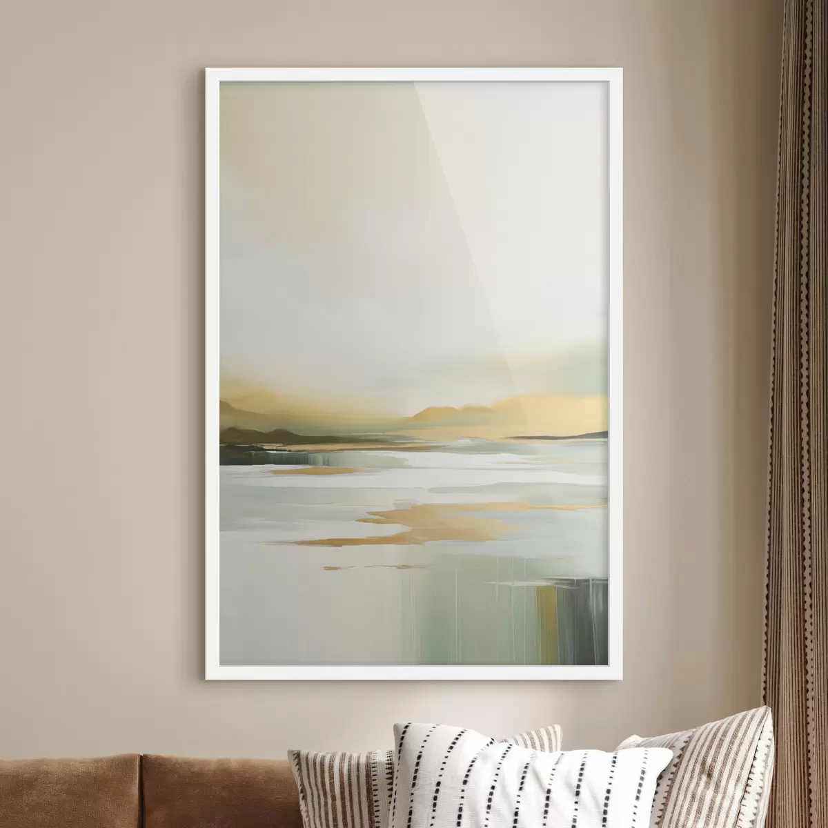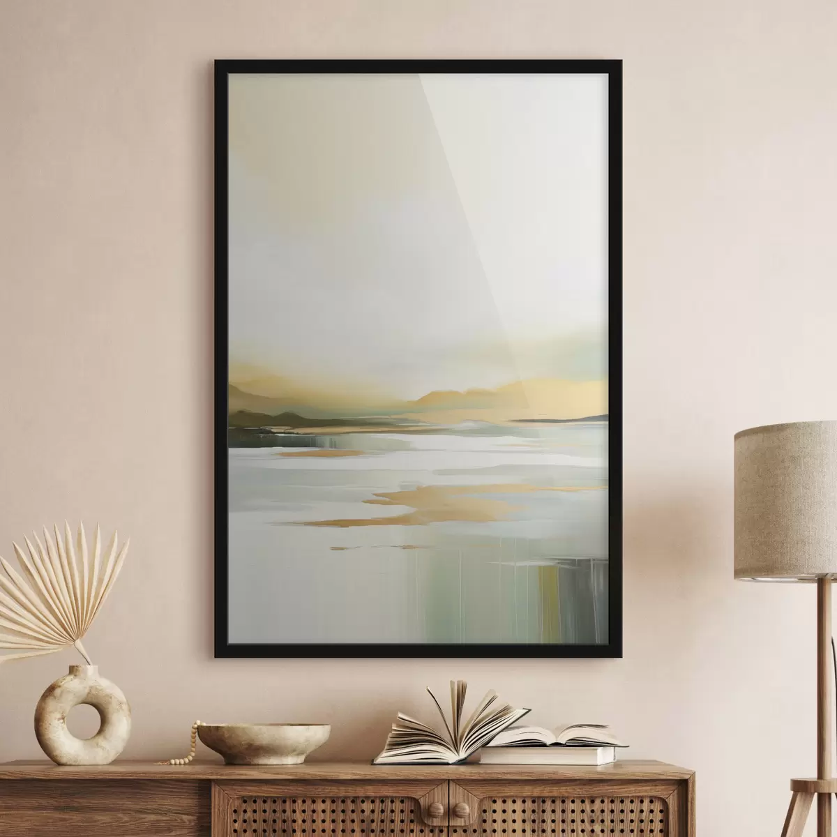 Poster Absztrakt táj sárga és zöld árnyalatokkal, az eget és a távoli hegyeket tükröző víz, halvány, ködös égbolt Nr f47439
