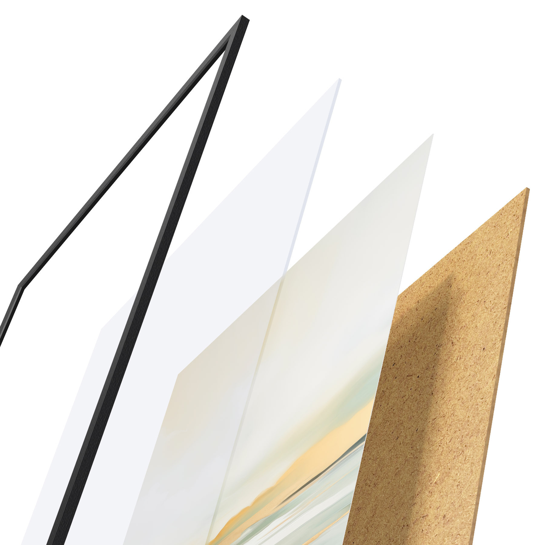 A poszter keretből, plexiből, nyomtatott képből és forgácslap hátlapból áll. A poszter a hátoldalon található rögzítőknek köszönhetően azonnal felakasztható a falra.