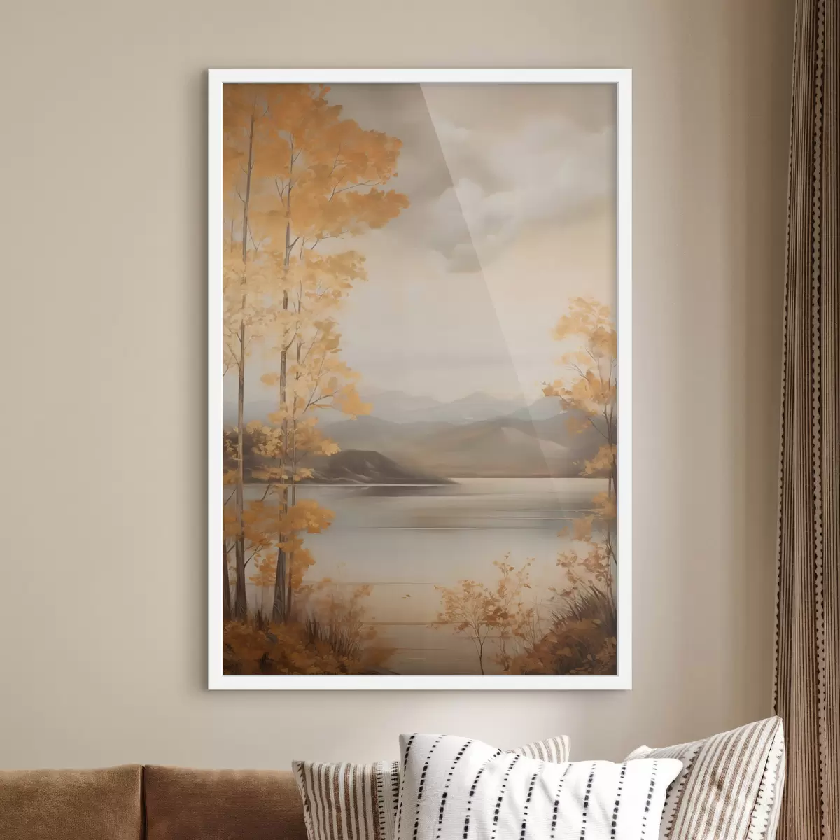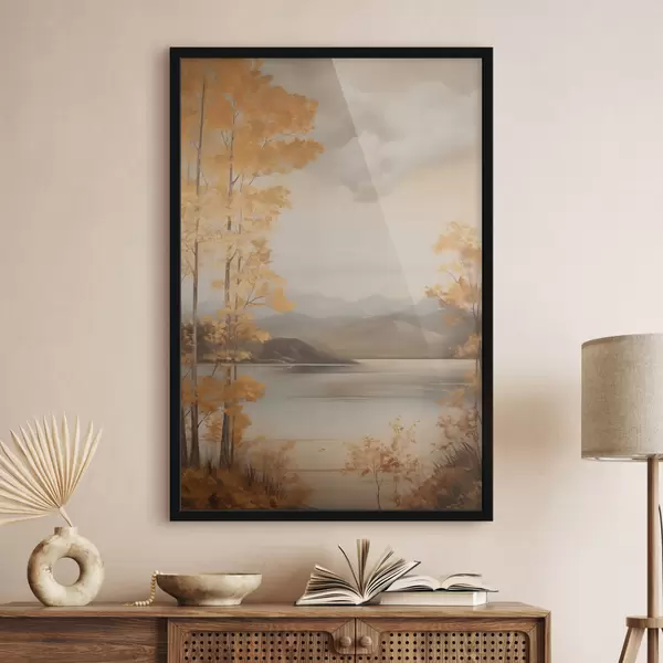 Poster Őszi textúrájú, narancssárga levelű fák keretezik a nyugodt tavat, amelynek túlsó partján a felhős ég alatt távoli hegyek láthatók. Nr f47441