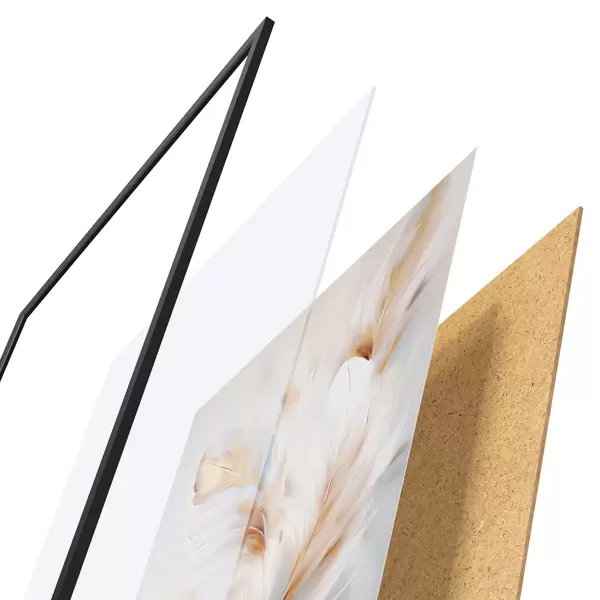 A poszter keretből, plexiből, nyomtatott képből és forgácslap hátlapból áll. A poszter a hátoldalon található rögzítőknek köszönhetően azonnal felakasztható a falra.