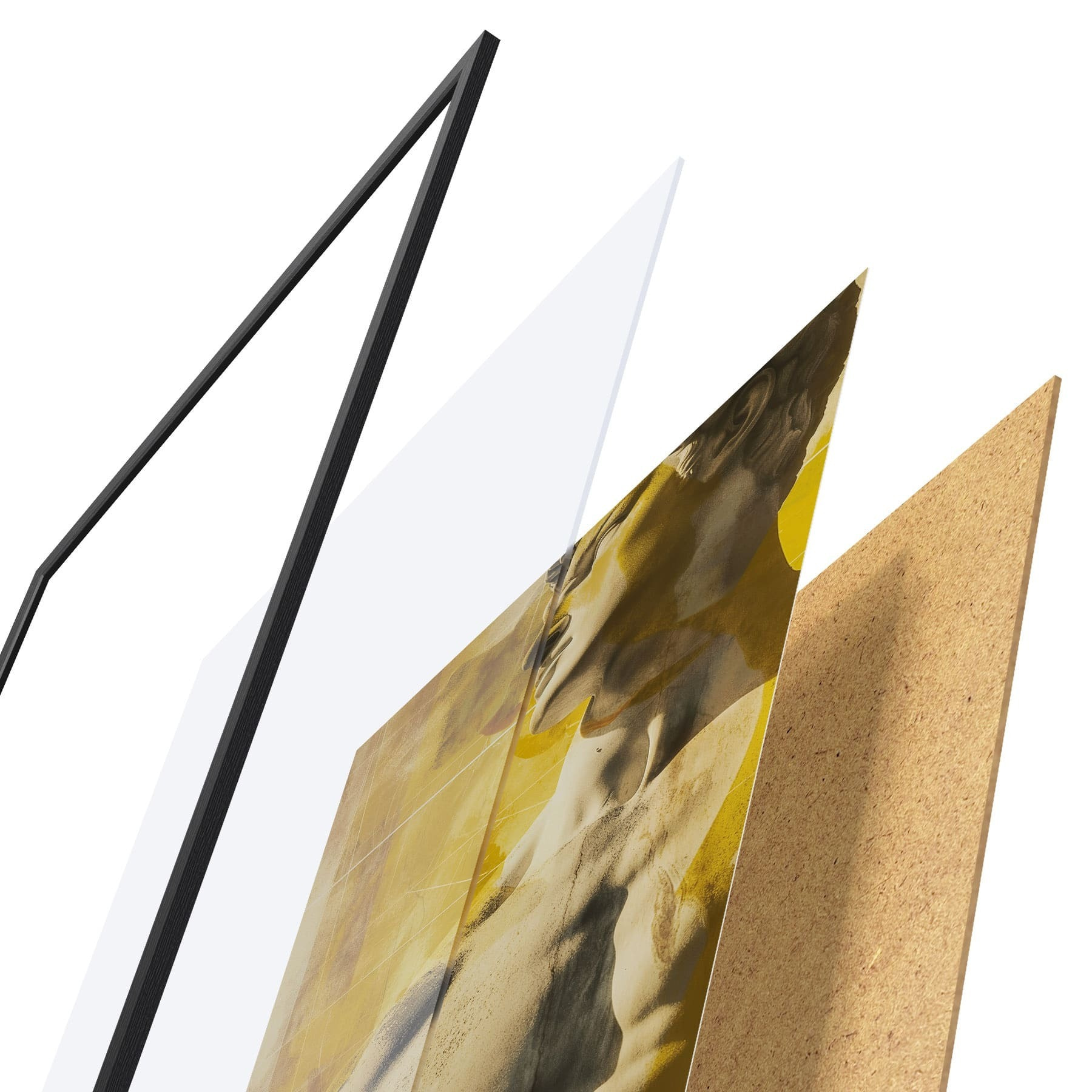 A poszter keretből, plexiből, nyomtatott képből és forgácslap hátlapból áll. A poszter a hátoldalon található rögzítőknek köszönhetően azonnal felakasztható a falra.