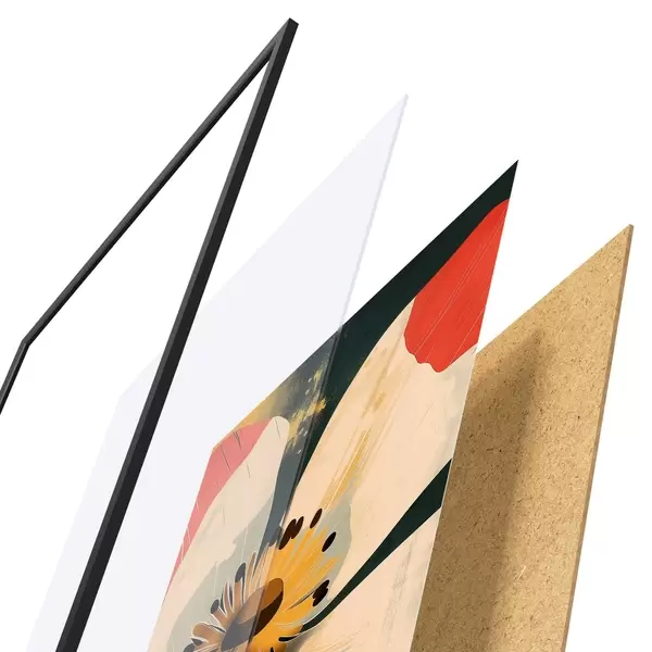 A poszter keretből, plexiből, nyomtatott képből és forgácslap hátlapból áll. A poszter a hátoldalon található rögzítőknek köszönhetően azonnal felakasztható a falra.