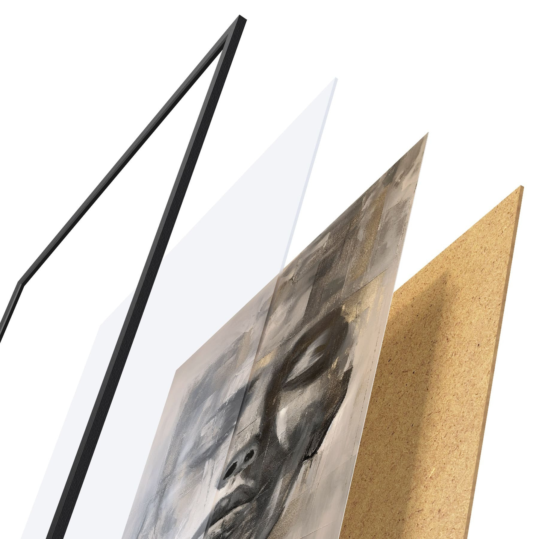 A poszter keretből, plexiből, nyomtatott képből és forgácslap hátlapból áll. A poszter a hátoldalon található rögzítőknek köszönhetően azonnal felakasztható a falra.