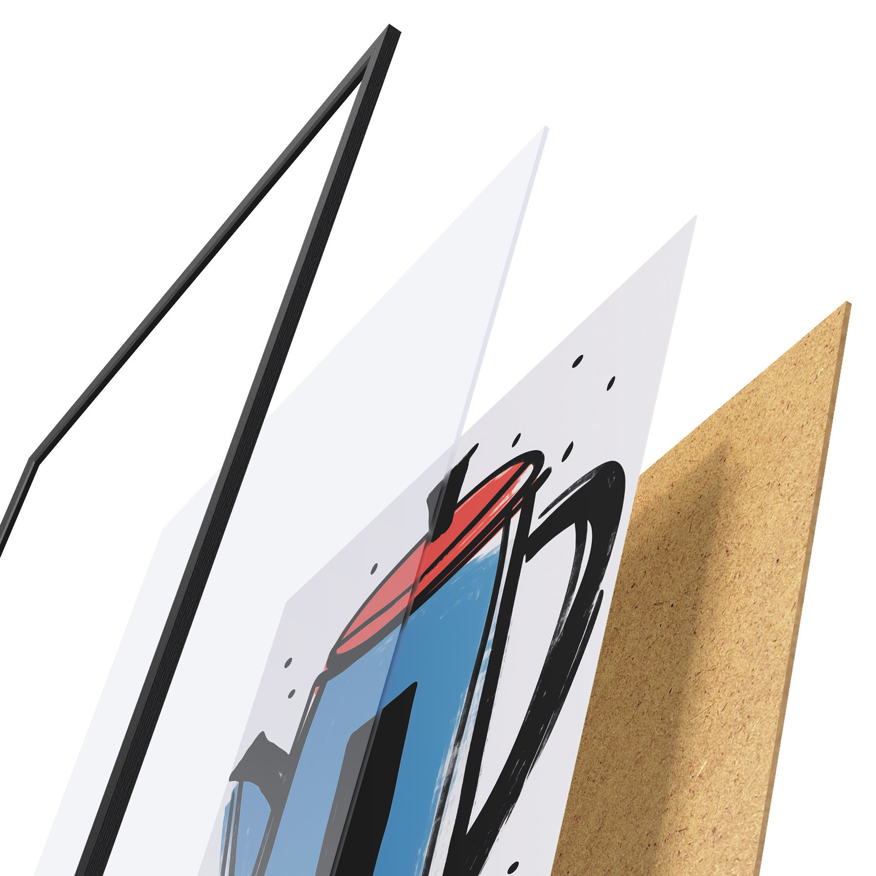 A poszter keretből, plexiből, nyomtatott képből és forgácslap hátlapból áll. A poszter a hátoldalon található rögzítőknek köszönhetően azonnal felakasztható a falra.