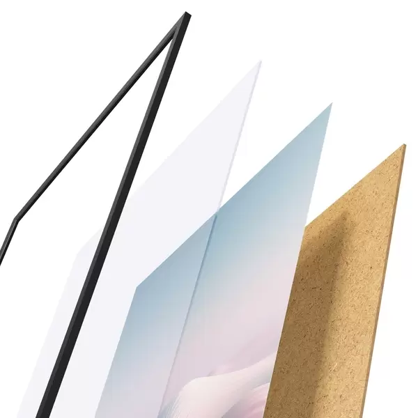 A poszter keretből, plexiből, nyomtatott képből és forgácslap hátlapból áll. A poszter a hátoldalon található rögzítőknek köszönhetően azonnal felakasztható a falra.