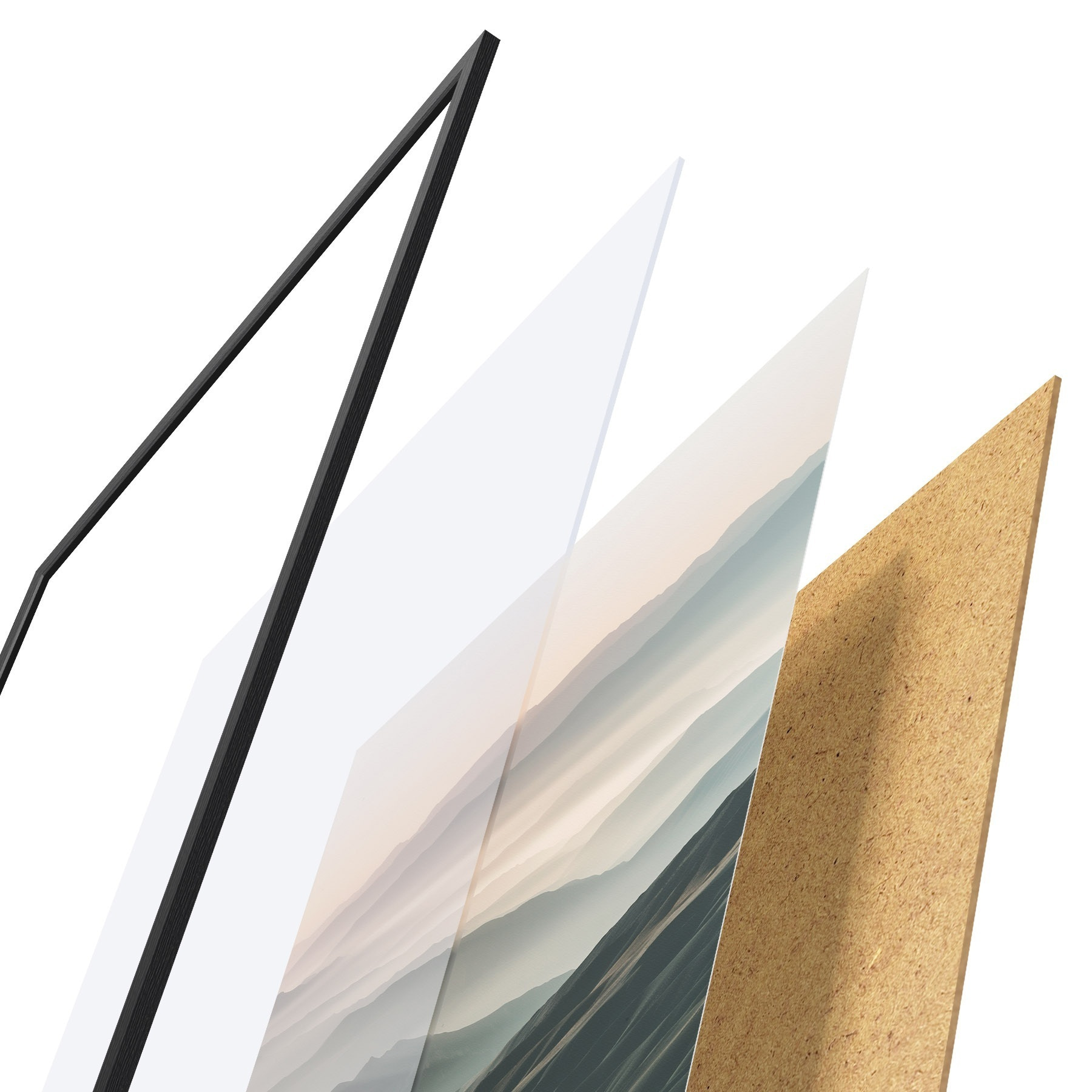 A poszter keretből, plexiből, nyomtatott képből és forgácslap hátlapból áll. A poszter a hátoldalon található rögzítőknek köszönhetően azonnal felakasztható a falra.