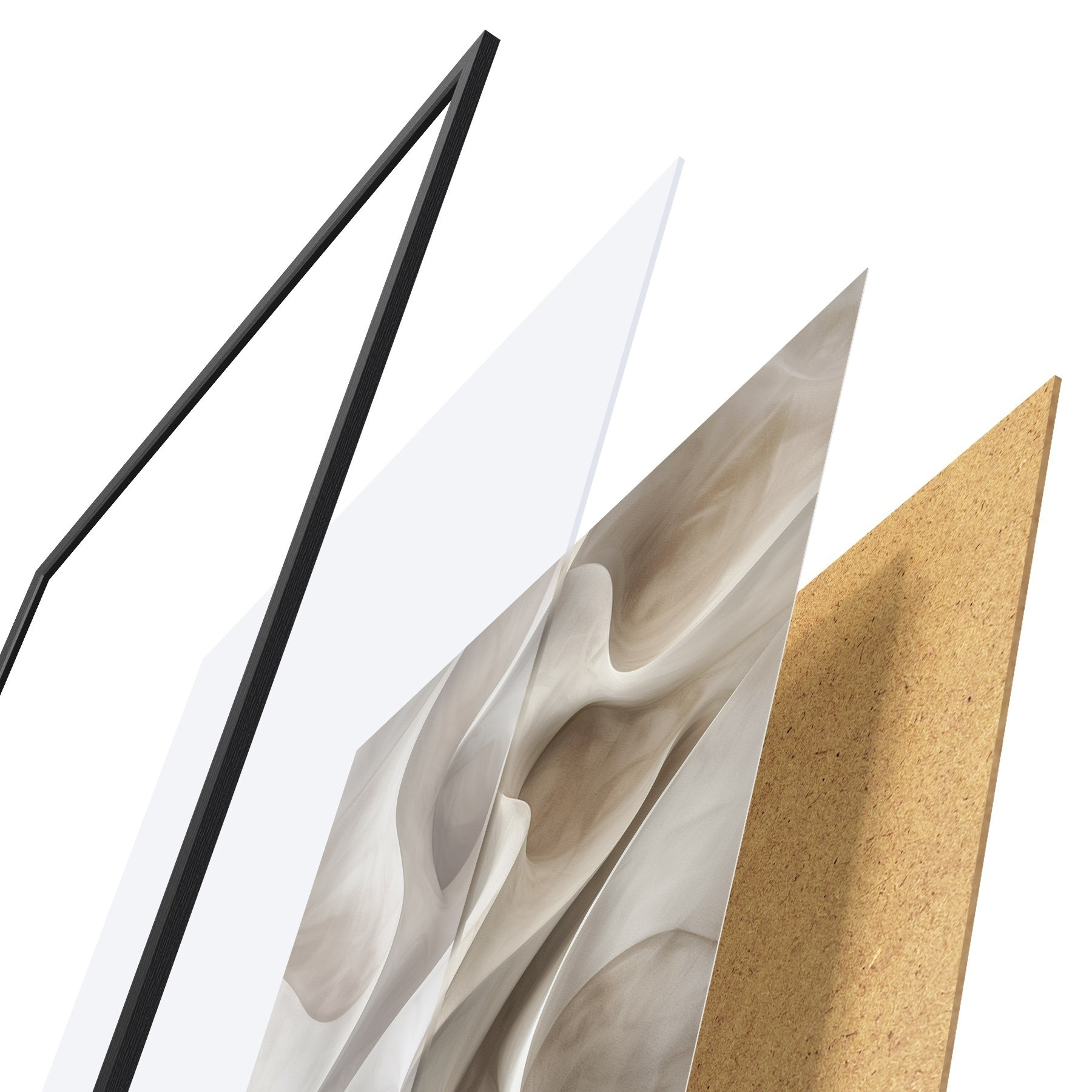 A poszter keretből, plexiből, nyomtatott képből és forgácslap hátlapból áll. A poszter a hátoldalon található rögzítőknek köszönhetően azonnal felakasztható a falra.
