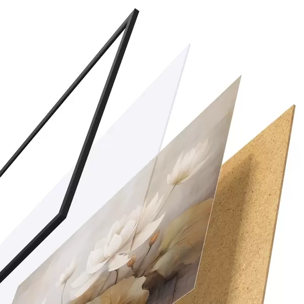 A poszter keretből, plexiből, nyomtatott képből és forgácslap hátlapból áll. A poszter a hátoldalon található rögzítőknek köszönhetően azonnal felakasztható a falra.