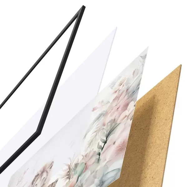 A poszter keretből, plexiből, nyomtatott képből és forgácslap hátlapból áll. A poszter a hátoldalon található rögzítőknek köszönhetően azonnal felakasztható a falra.