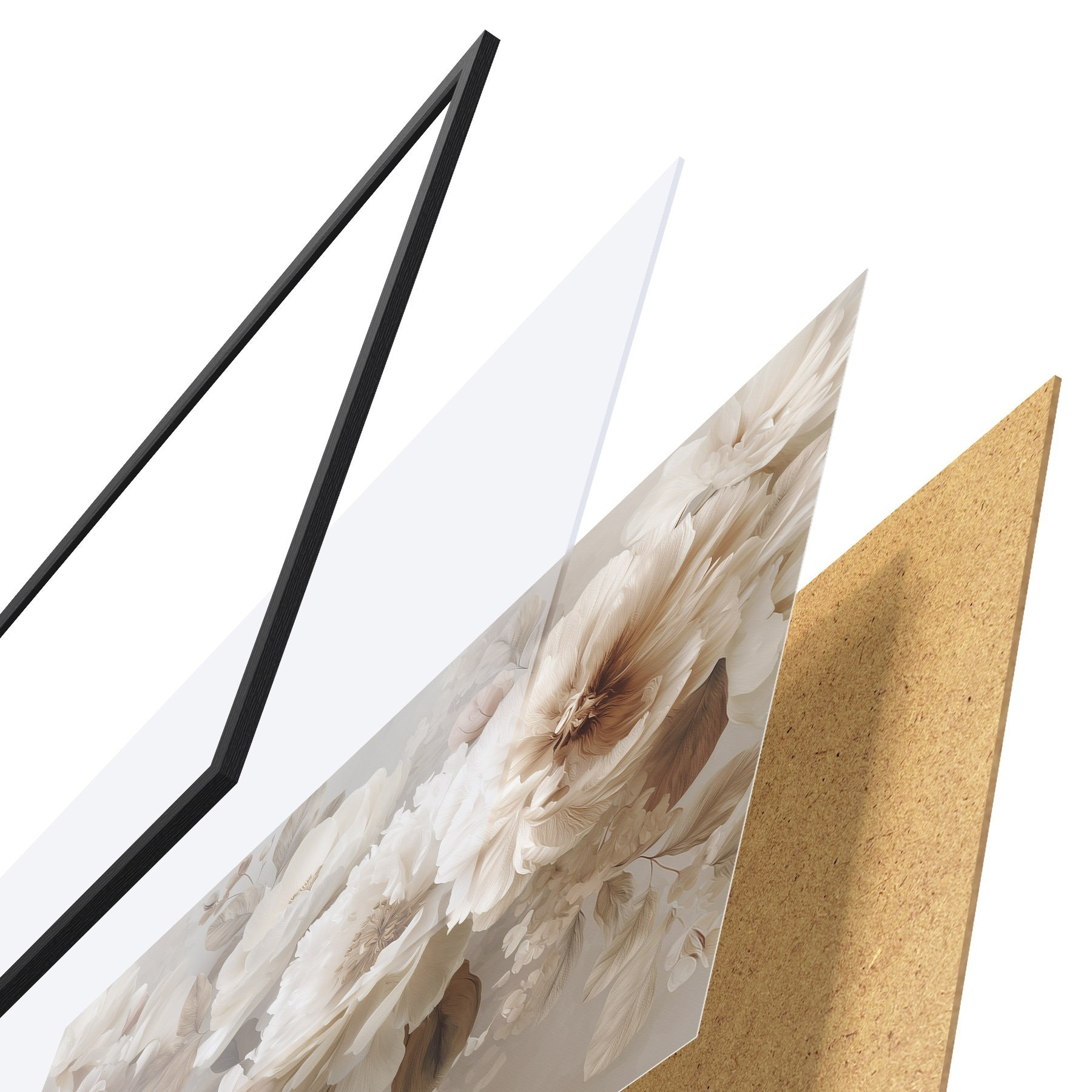 A poszter keretből, plexiből, nyomtatott képből és forgácslap hátlapból áll. A poszter a hátoldalon található rögzítőknek köszönhetően azonnal felakasztható a falra.