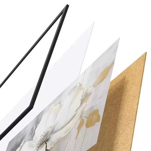 A poszter keretből, plexiből, nyomtatott képből és forgácslap hátlapból áll. A poszter a hátoldalon található rögzítőknek köszönhetően azonnal felakasztható a falra.