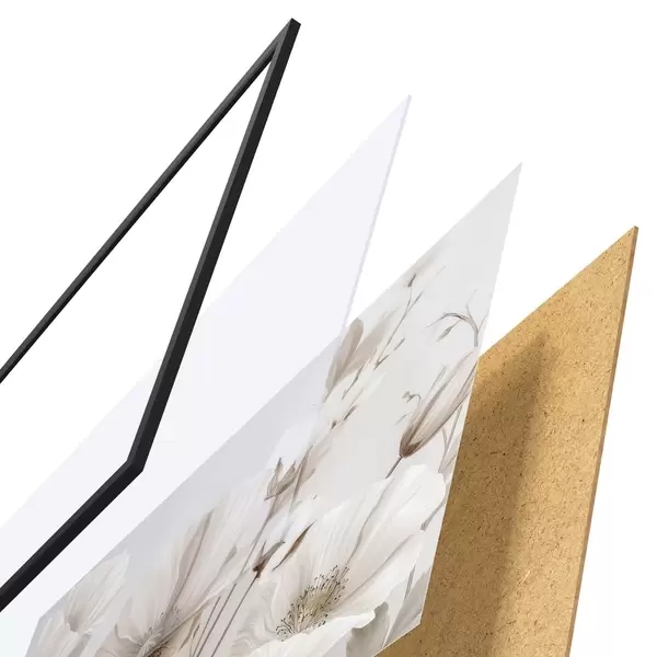A poszter keretből, plexiből, nyomtatott képből és forgácslap hátlapból áll. A poszter a hátoldalon található rögzítőknek köszönhetően azonnal felakasztható a falra.