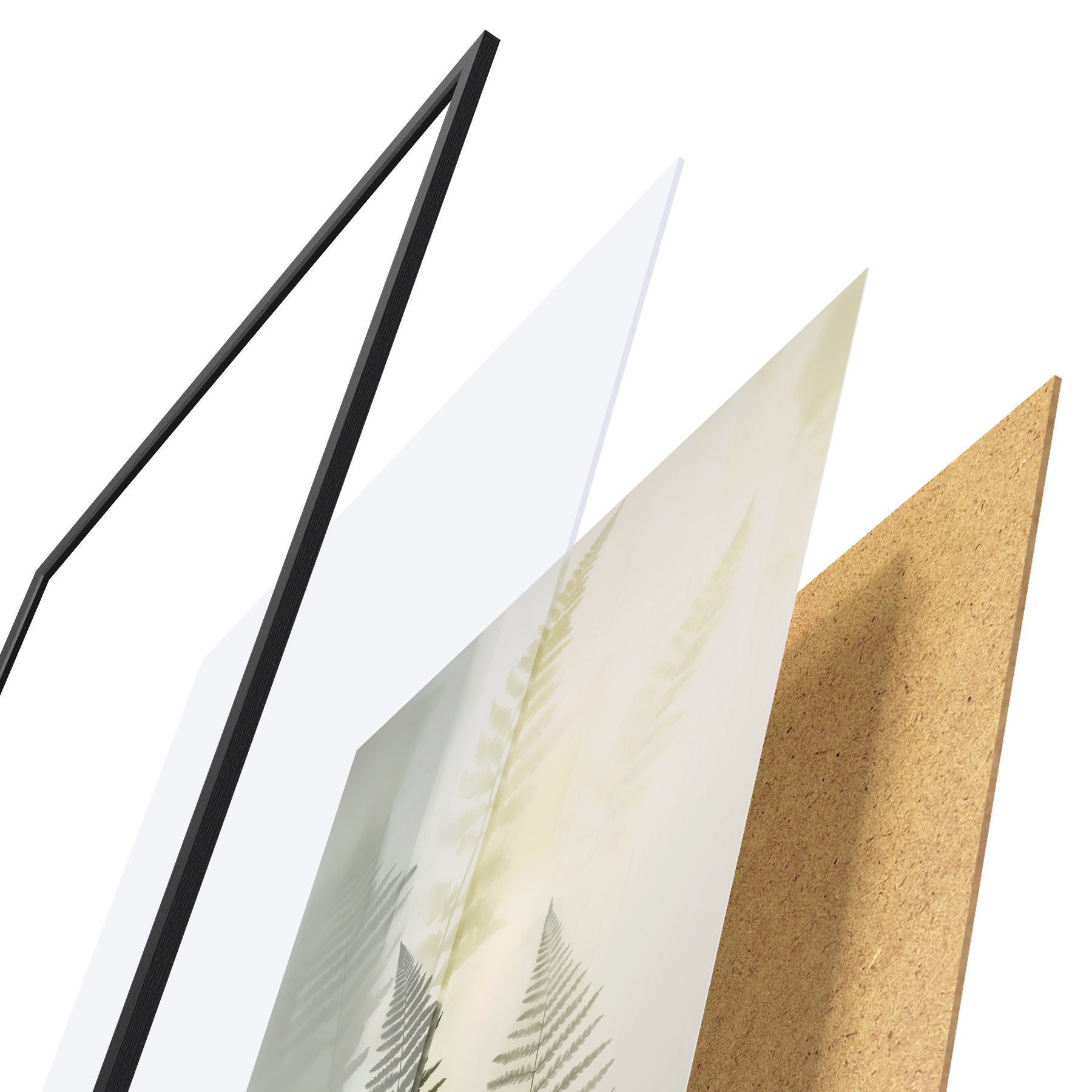 A poszter keretből, plexiből, nyomtatott képből és forgácslap hátlapból áll. A poszter a hátoldalon található rögzítőknek köszönhetően azonnal felakasztható a falra.