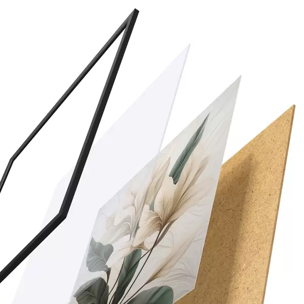A poszter keretből, plexiből, nyomtatott képből és forgácslap hátlapból áll. A poszter a hátoldalon található rögzítőknek köszönhetően azonnal felakasztható a falra.