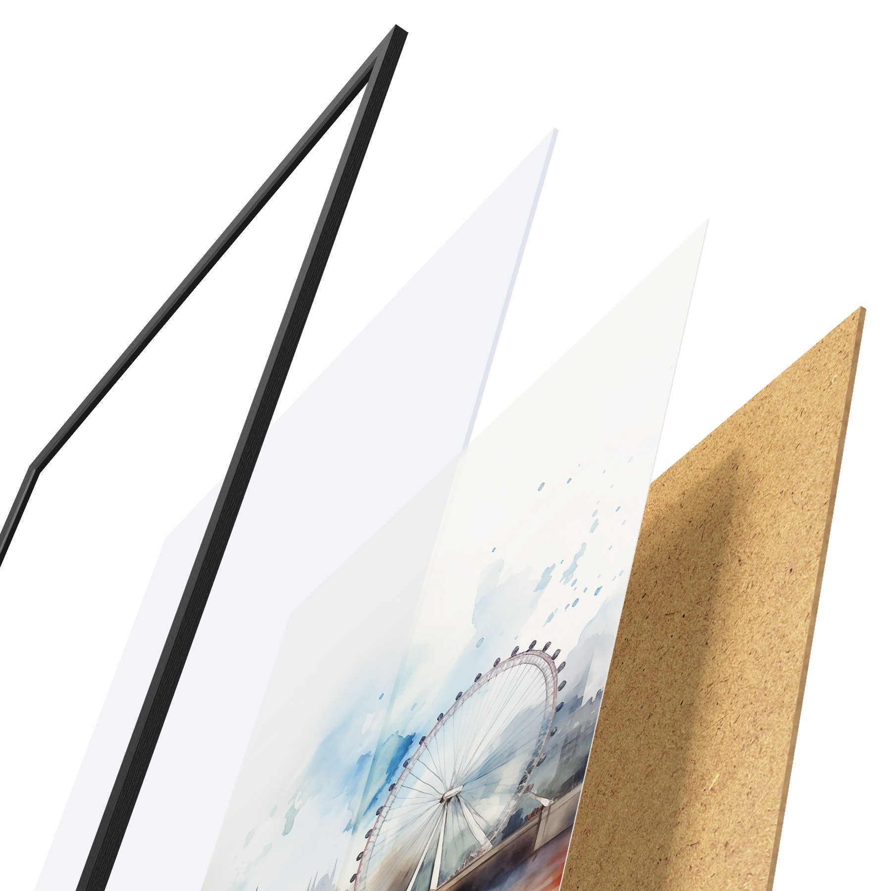 A poszter keretből, plexiből, nyomtatott képből és forgácslap hátlapból áll. A poszter a hátoldalon található rögzítőknek köszönhetően azonnal felakasztható a falra.