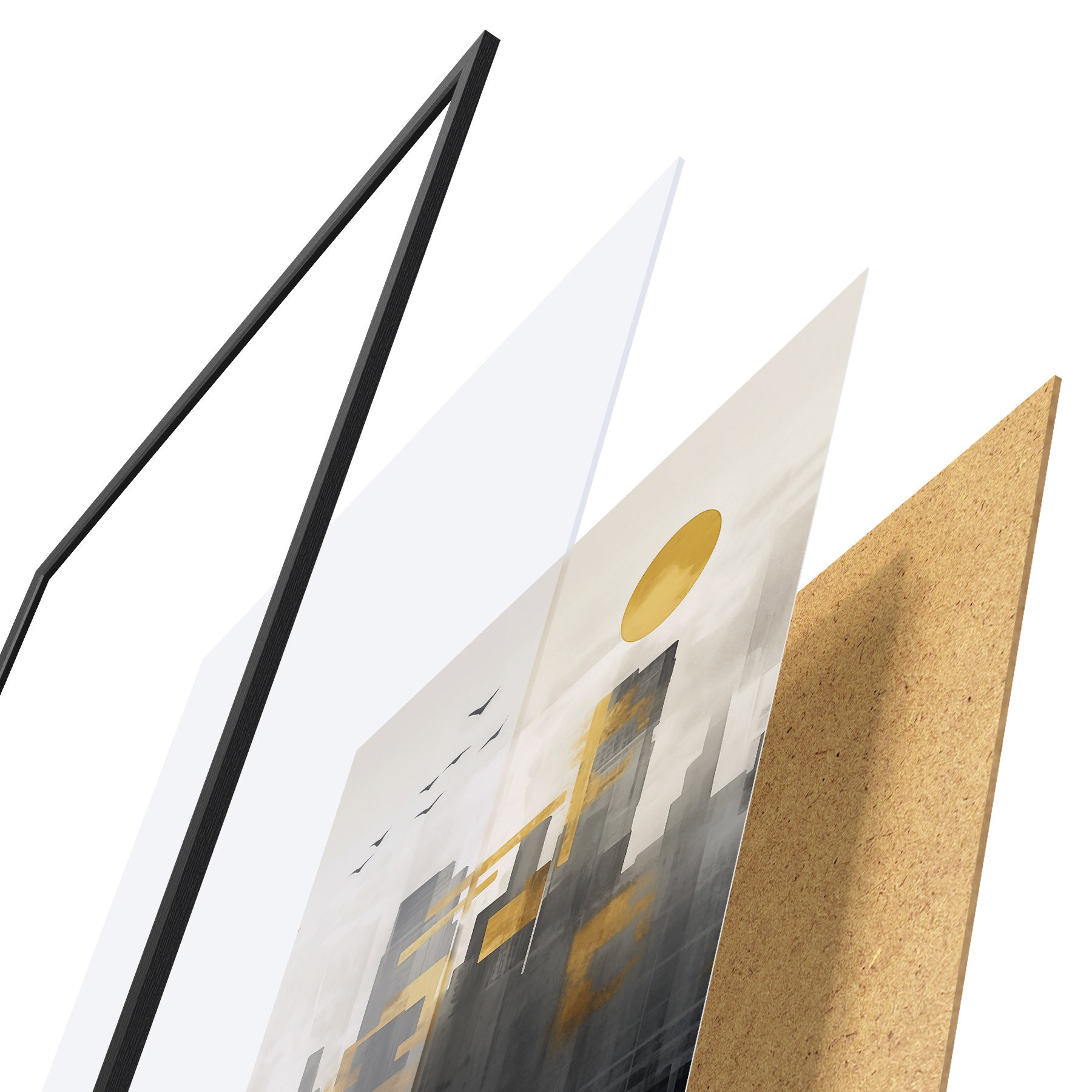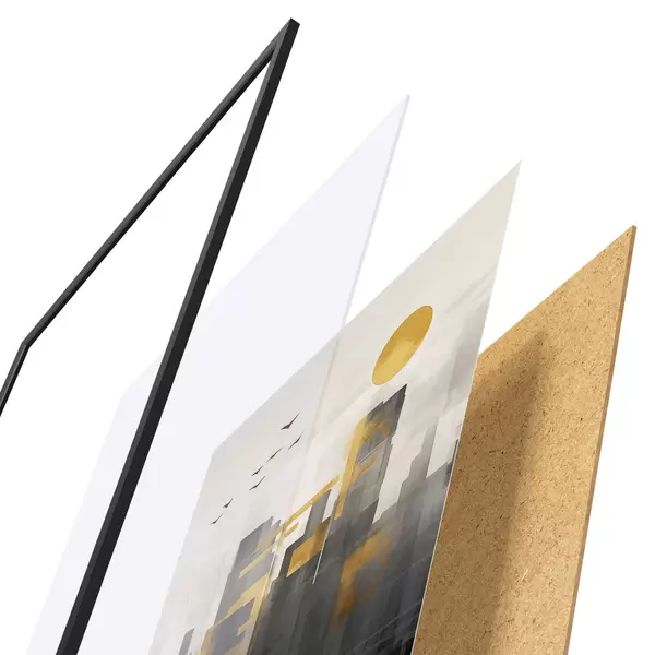 A poszter keretből, plexiből, nyomtatott képből és forgácslap hátlapból áll. A poszter a hátoldalon található rögzítőknek köszönhetően azonnal felakasztható a falra.