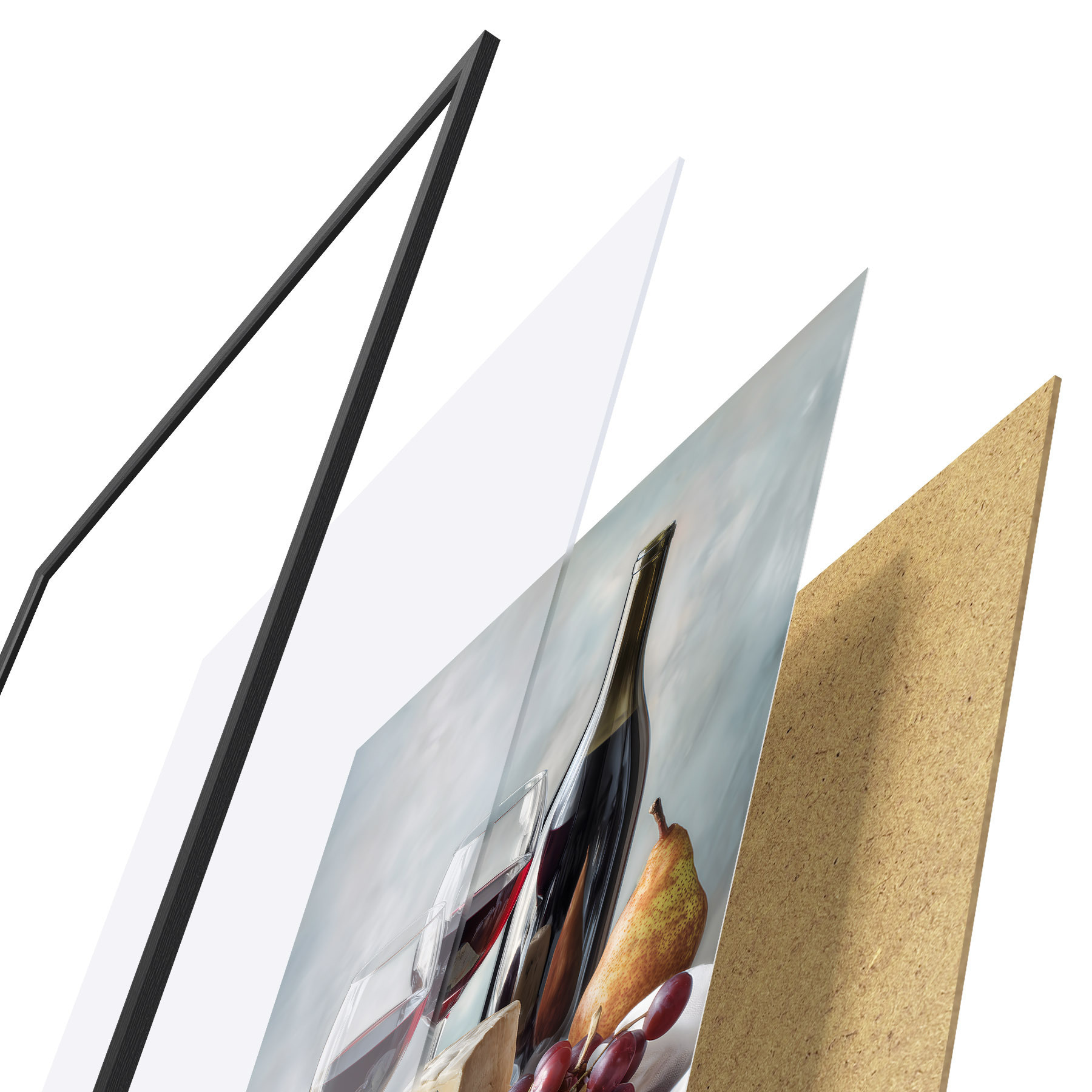 A poszter keretből, plexiből, nyomtatott képből és forgácslap hátlapból áll. A poszter a hátoldalon található rögzítőknek köszönhetően azonnal felakasztható a falra.