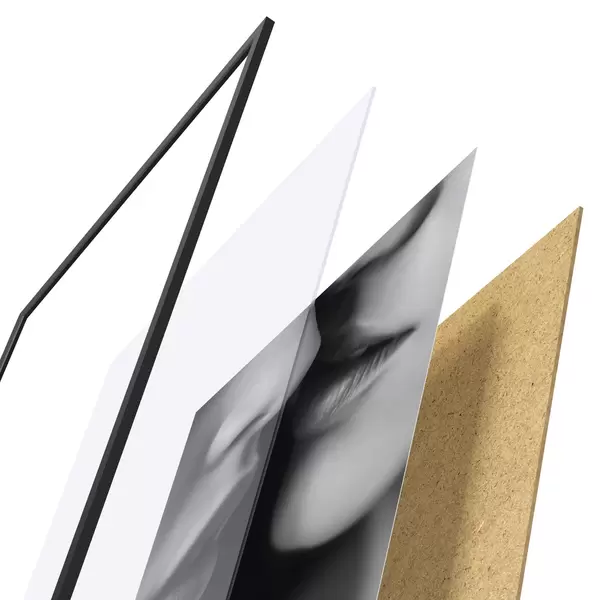 A poszter keretből, plexiből, nyomtatott képből és forgácslap hátlapból áll. A poszter a hátoldalon található rögzítőknek köszönhetően azonnal felakasztható a falra.