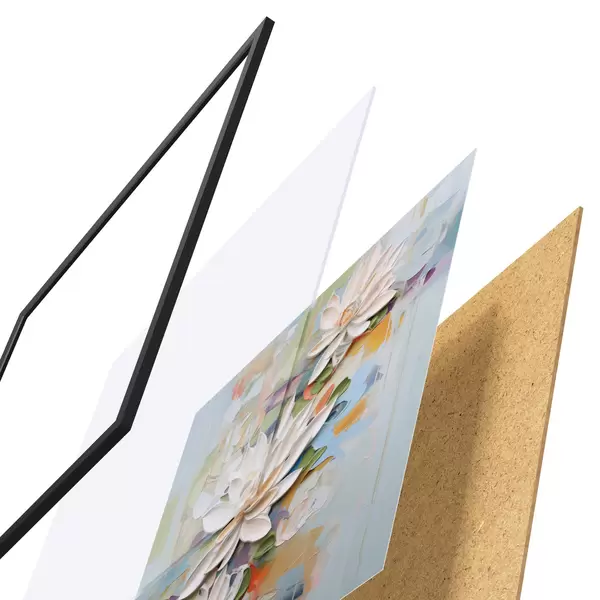 A poszter keretből, plexiből, nyomtatott képből és forgácslap hátlapból áll. A poszter a hátoldalon található rögzítőknek köszönhetően azonnal felakasztható a falra.