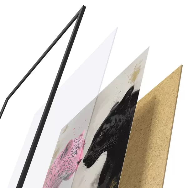 A poszter keretből, plexiből, nyomtatott képből és forgácslap hátlapból áll. A poszter a hátoldalon található rögzítőknek köszönhetően azonnal felakasztható a falra.