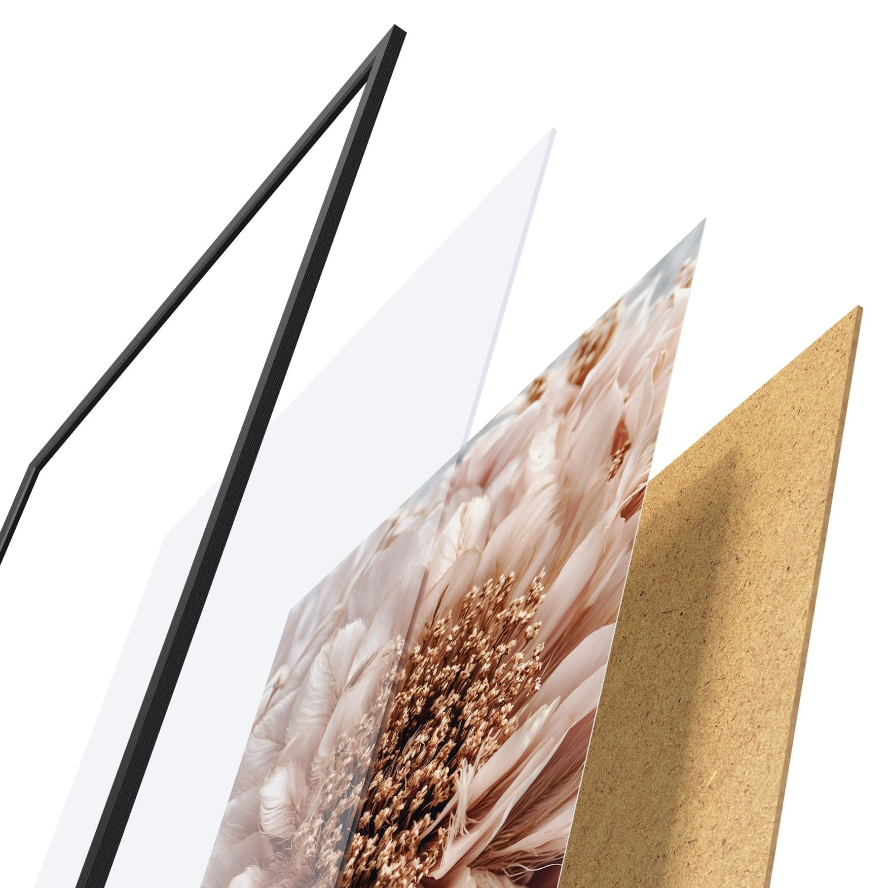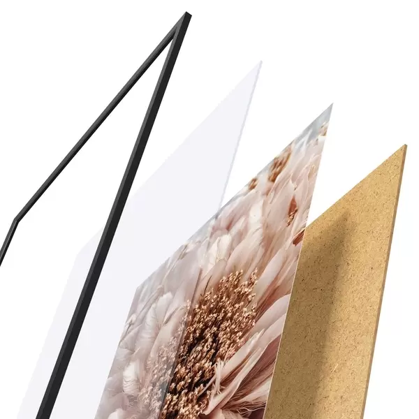 A poszter keretből, plexiből, nyomtatott képből és forgácslap hátlapból áll. A poszter a hátoldalon található rögzítőknek köszönhetően azonnal felakasztható a falra.