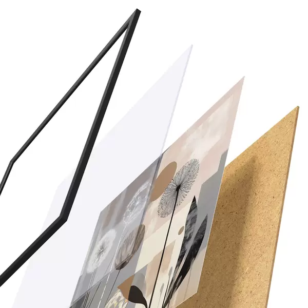 A poszter keretből, plexiből, nyomtatott képből és forgácslap hátlapból áll. A poszter a hátoldalon található rögzítőknek köszönhetően azonnal felakasztható a falra.