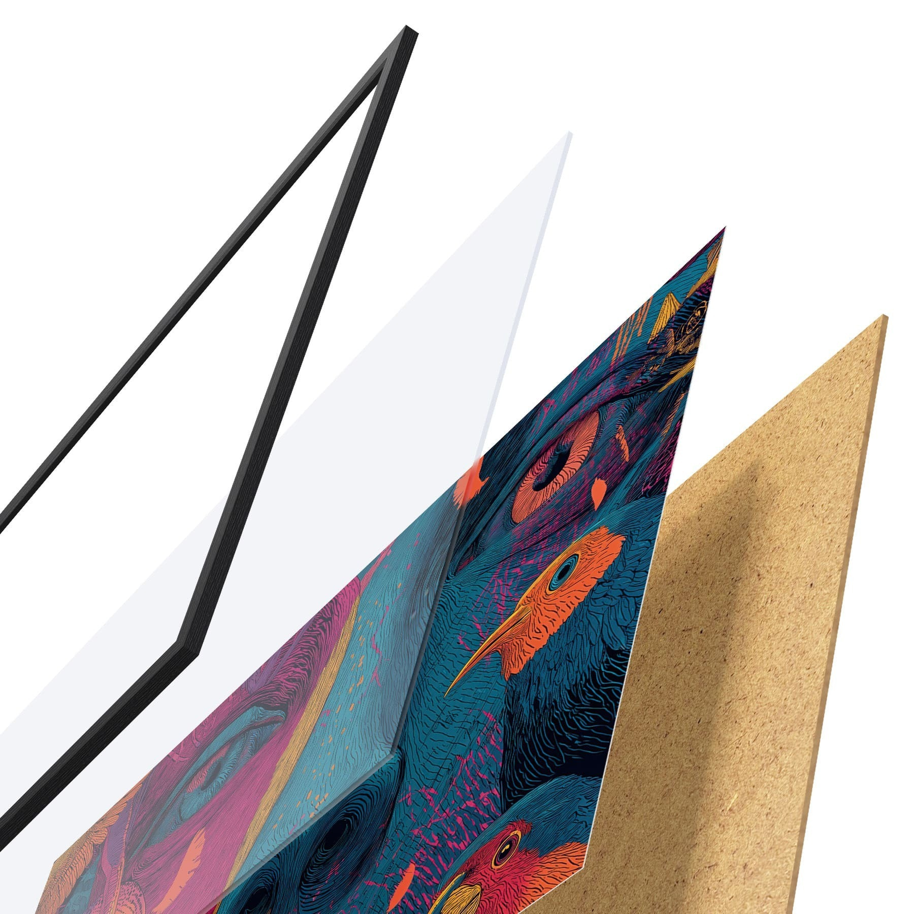 A poszter keretből, plexiből, nyomtatott képből és forgácslap hátlapból áll. A poszter a hátoldalon található rögzítőknek köszönhetően azonnal felakasztható a falra.