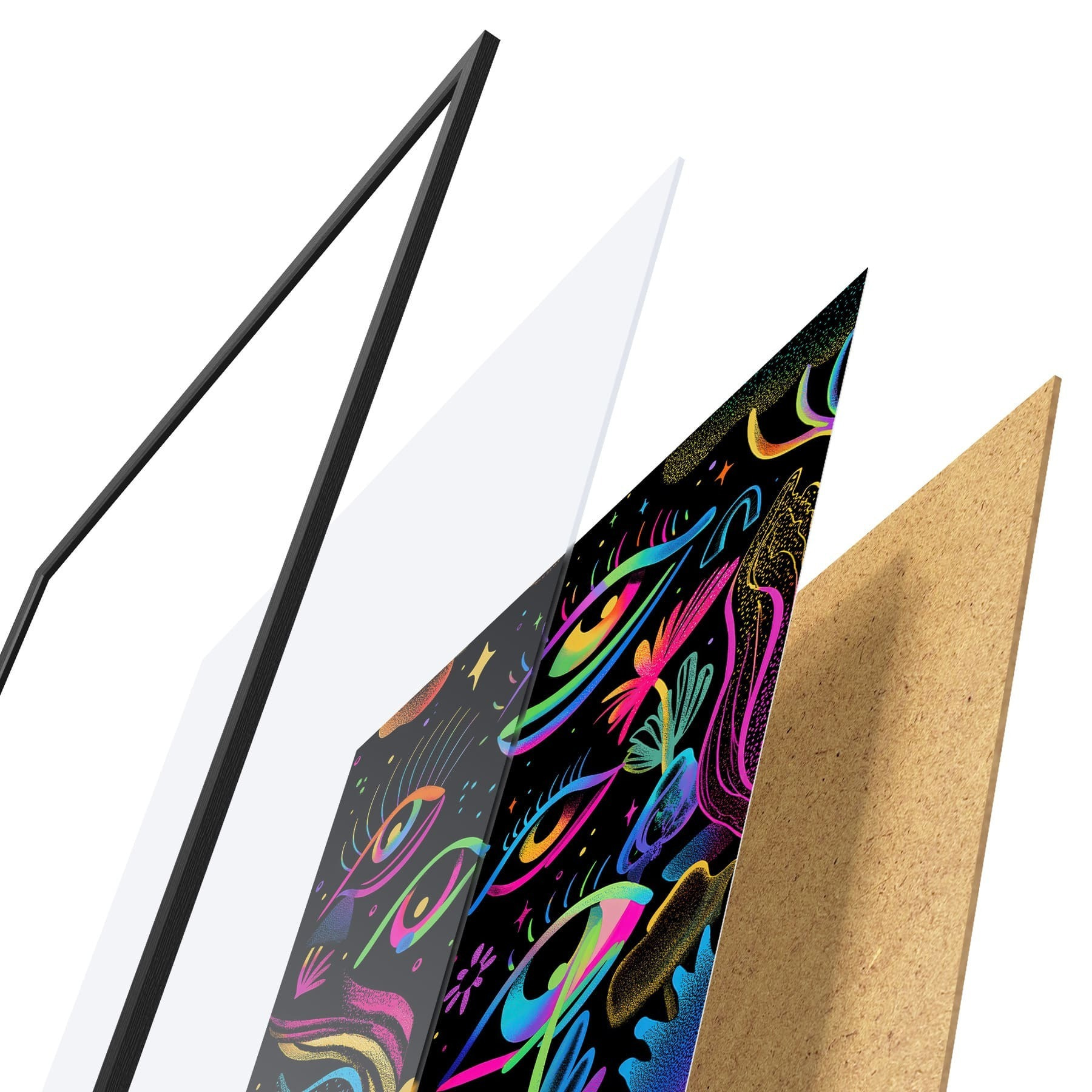 A poszter keretből, plexiből, nyomtatott képből és forgácslap hátlapból áll. A poszter a hátoldalon található rögzítőknek köszönhetően azonnal felakasztható a falra.