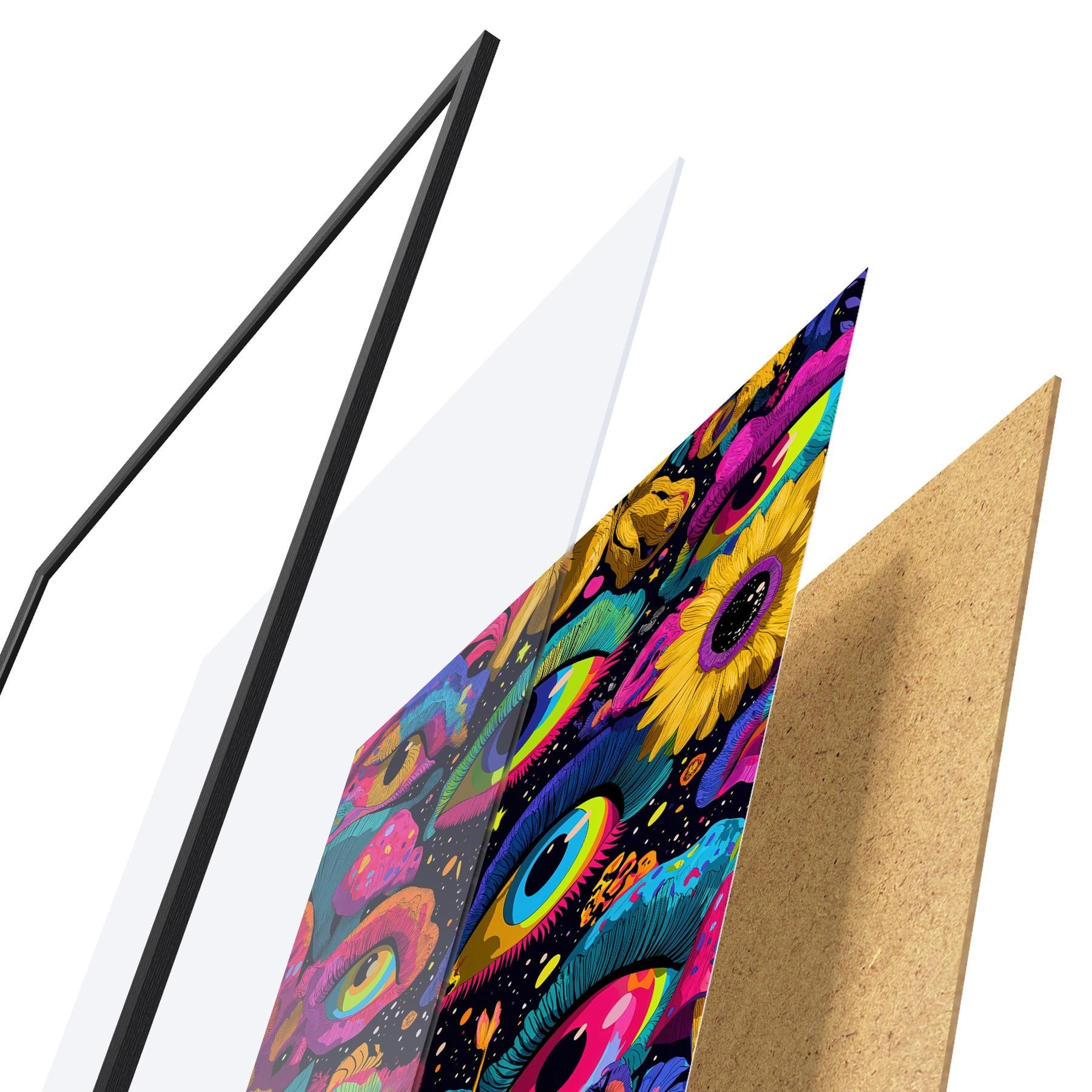 A poszter keretből, plexiből, nyomtatott képből és forgácslap hátlapból áll. A poszter a hátoldalon található rögzítőknek köszönhetően azonnal felakasztható a falra.