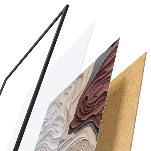 A poszter keretből, plexiből, nyomtatott képből és forgácslap hátlapból áll. A poszter a hátoldalon található rögzítőknek köszönhetően azonnal felakasztható a falra.