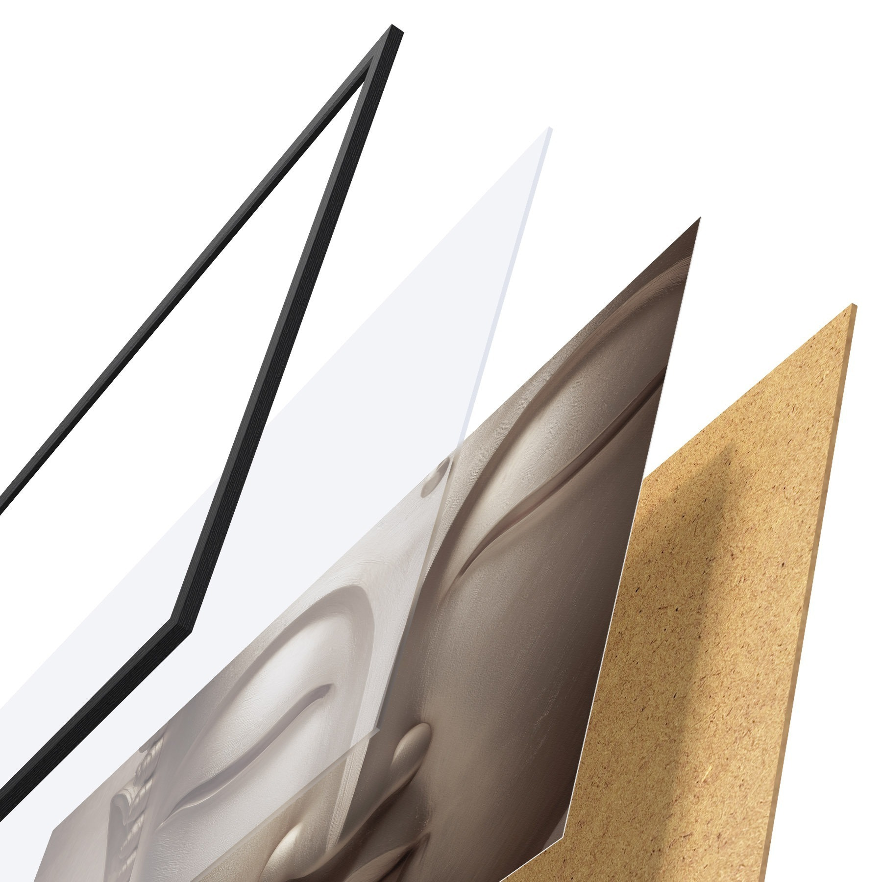 A poszter keretből, plexiből, nyomtatott képből és forgácslap hátlapból áll. A poszter a hátoldalon található rögzítőknek köszönhetően azonnal felakasztható a falra.