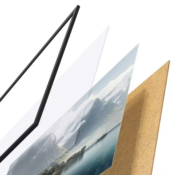 A poszter keretből, plexiből, nyomtatott képből és forgácslap hátlapból áll. A poszter a hátoldalon található rögzítőknek köszönhetően azonnal felakasztható a falra.