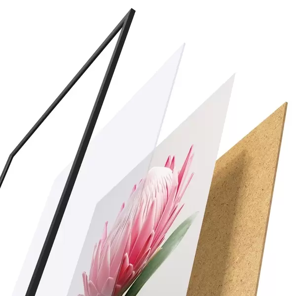 A poszter keretből, plexiből, nyomtatott képből és forgácslap hátlapból áll. A poszter a hátoldalon található rögzítőknek köszönhetően azonnal felakasztható a falra.