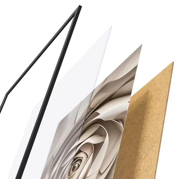 A poszter keretből, plexiből, nyomtatott képből és forgácslap hátlapból áll. A poszter a hátoldalon található rögzítőknek köszönhetően azonnal felakasztható a falra.