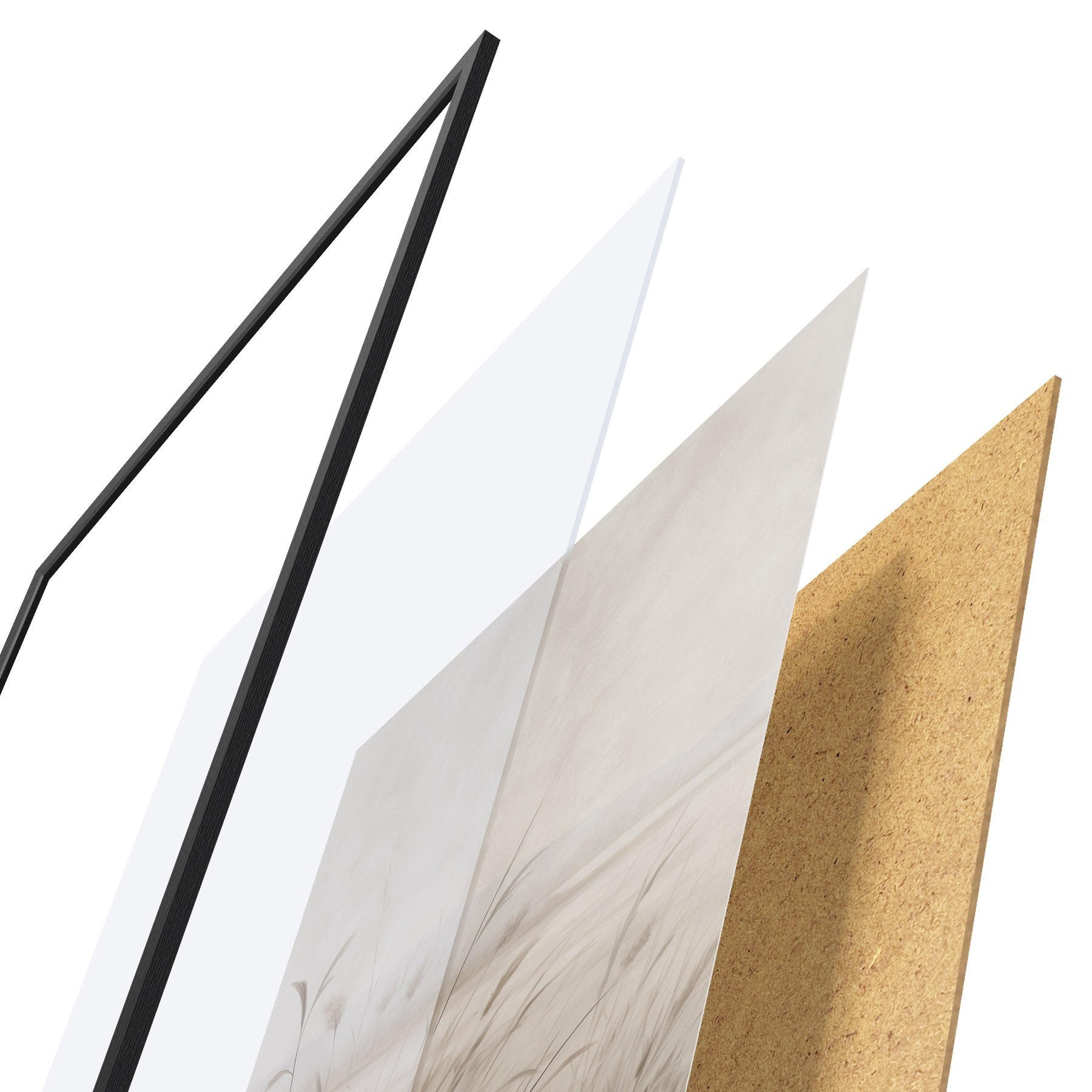 A poszter keretből, plexiből, nyomtatott képből és forgácslap hátlapból áll. A poszter a hátoldalon található rögzítőknek köszönhetően azonnal felakasztható a falra.