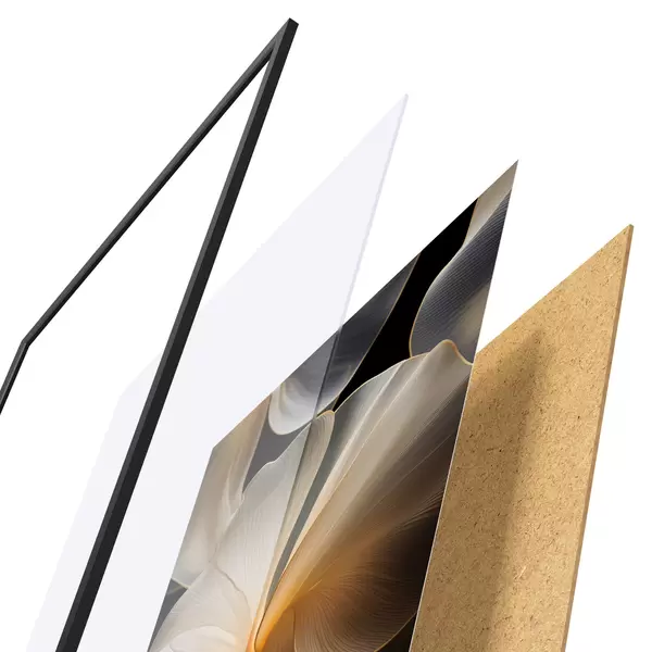A poszter keretből, plexiből, nyomtatott képből és forgácslap hátlapból áll. A poszter a hátoldalon található rögzítőknek köszönhetően azonnal felakasztható a falra.