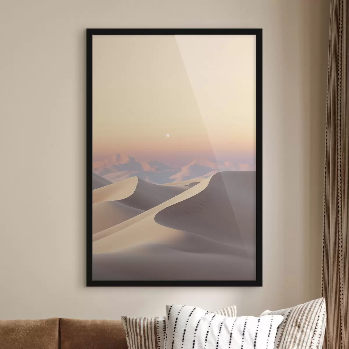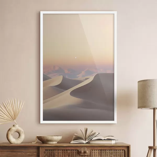 Plakát a sziklán Sivatagi táj hullámzó homokdűnékkel, lágy pasztell színű égbolton, távoli hegyekkel a háttérben f47865