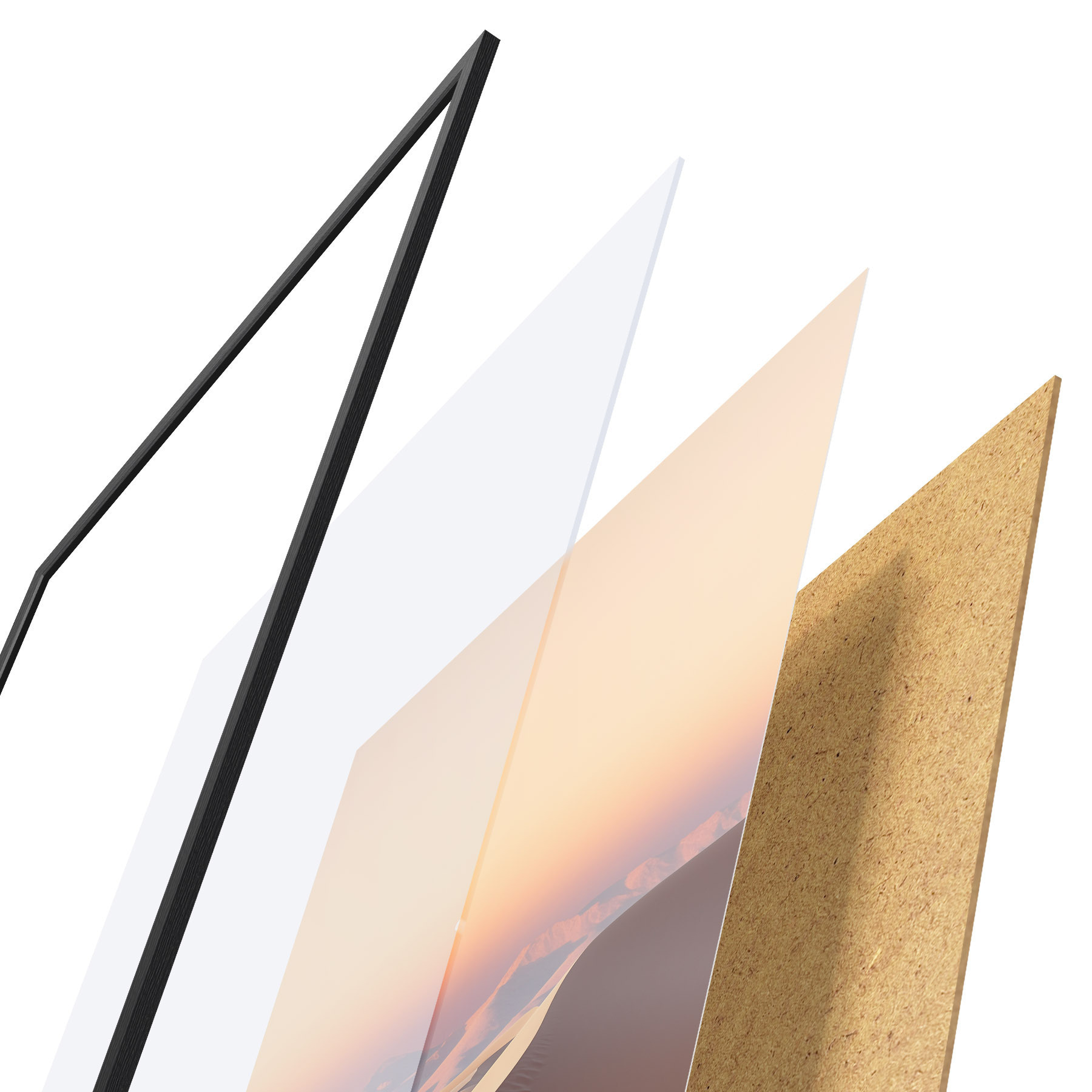 A poszter keretből, plexiből, nyomtatott képből és forgácslap hátlapból áll. A poszter a hátoldalon található rögzítőknek köszönhetően azonnal felakasztható a falra.