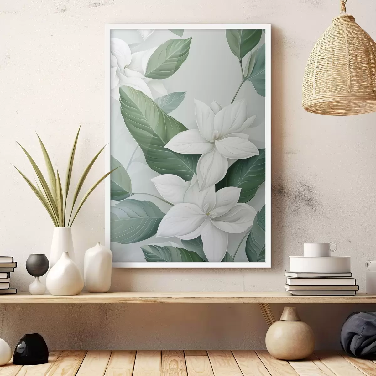 Plakát a sziklán Fehér virágok zöld levelekkel, pasztell háttérrel f47869