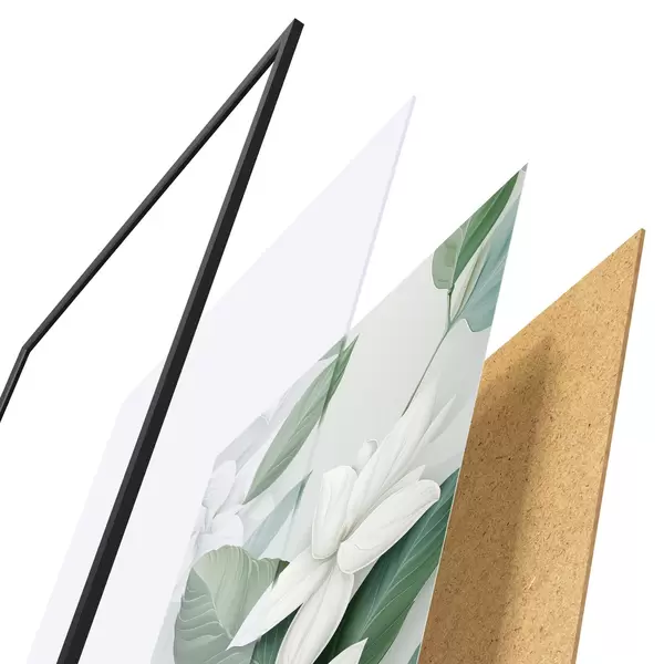 A poszter keretből, plexiből, nyomtatott képből és forgácslap hátlapból áll. A poszter a hátoldalon található rögzítőknek köszönhetően azonnal felakasztható a falra.