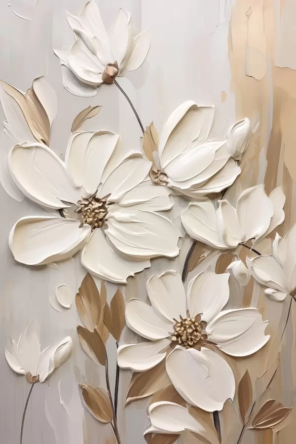 Poster Absztrakt fehér virágok texturált szirmokkal, semleges háttér előtt, finom ecsetvonásokkal imitálva. Nr f47873