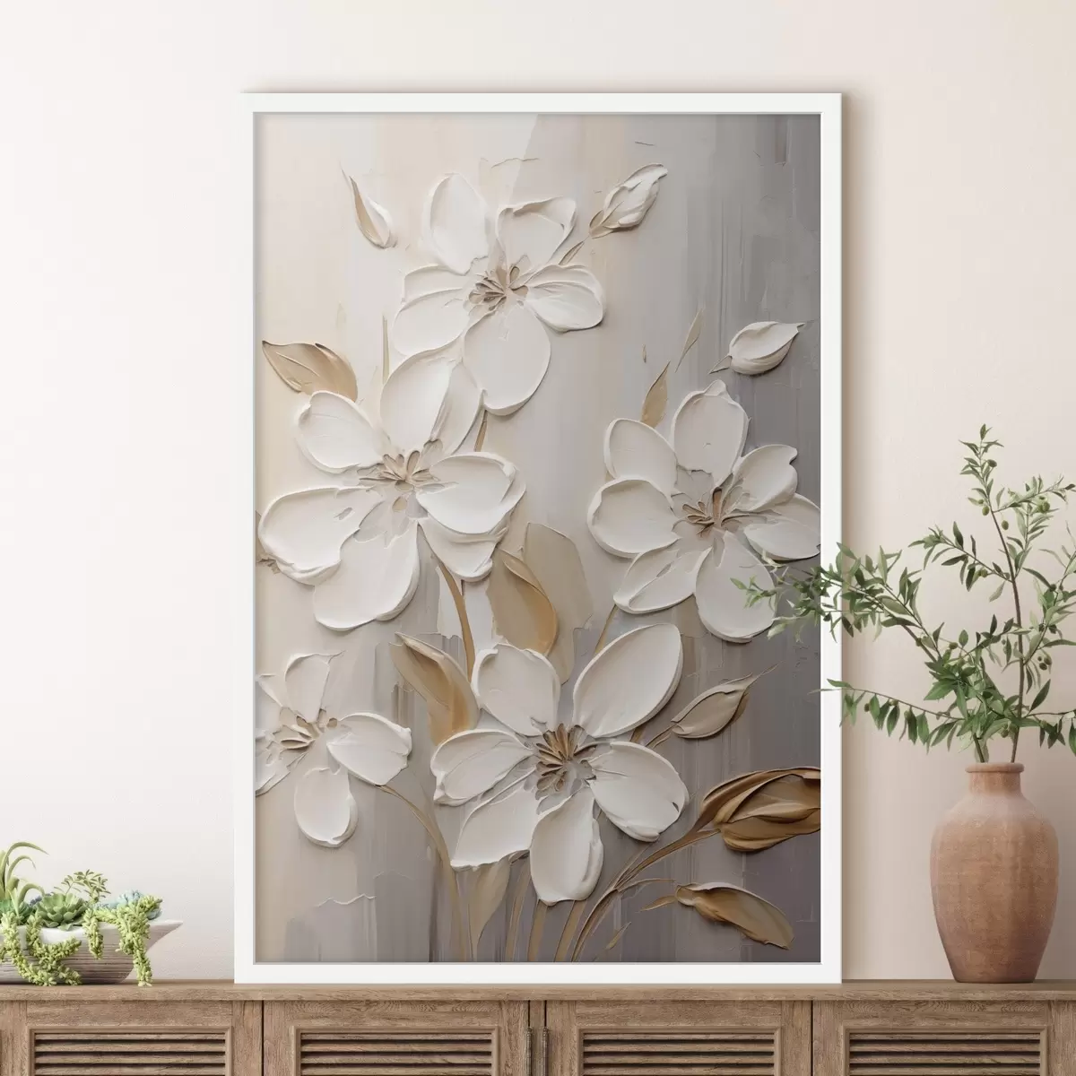 Poster Absztrakt fehér virágok texturált szirmokkal, semleges háttér előtt, finom ecsetvonásokkal imitálva. Nr f47874