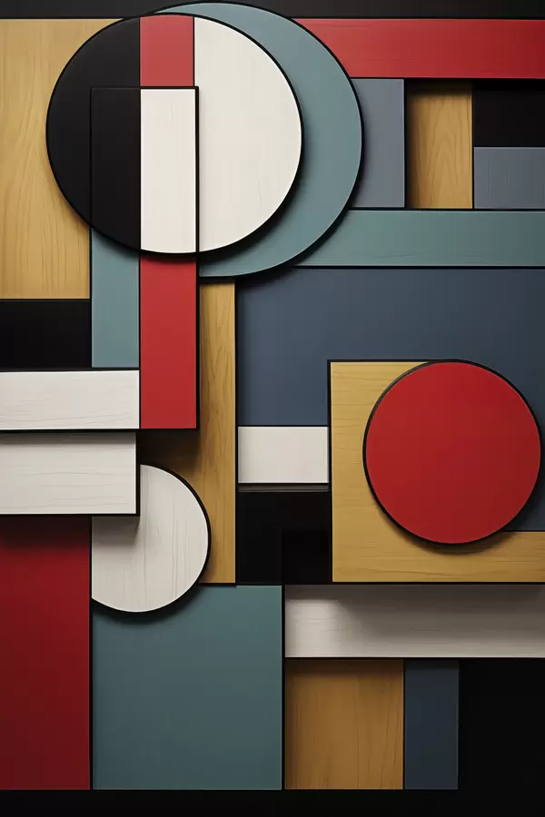 Poster Absztrakt geometrikus kompozíció fa textúra utánzattal, piros, fekete, fehér és türkizkék téglalapokkal és körökkel Nr f47875